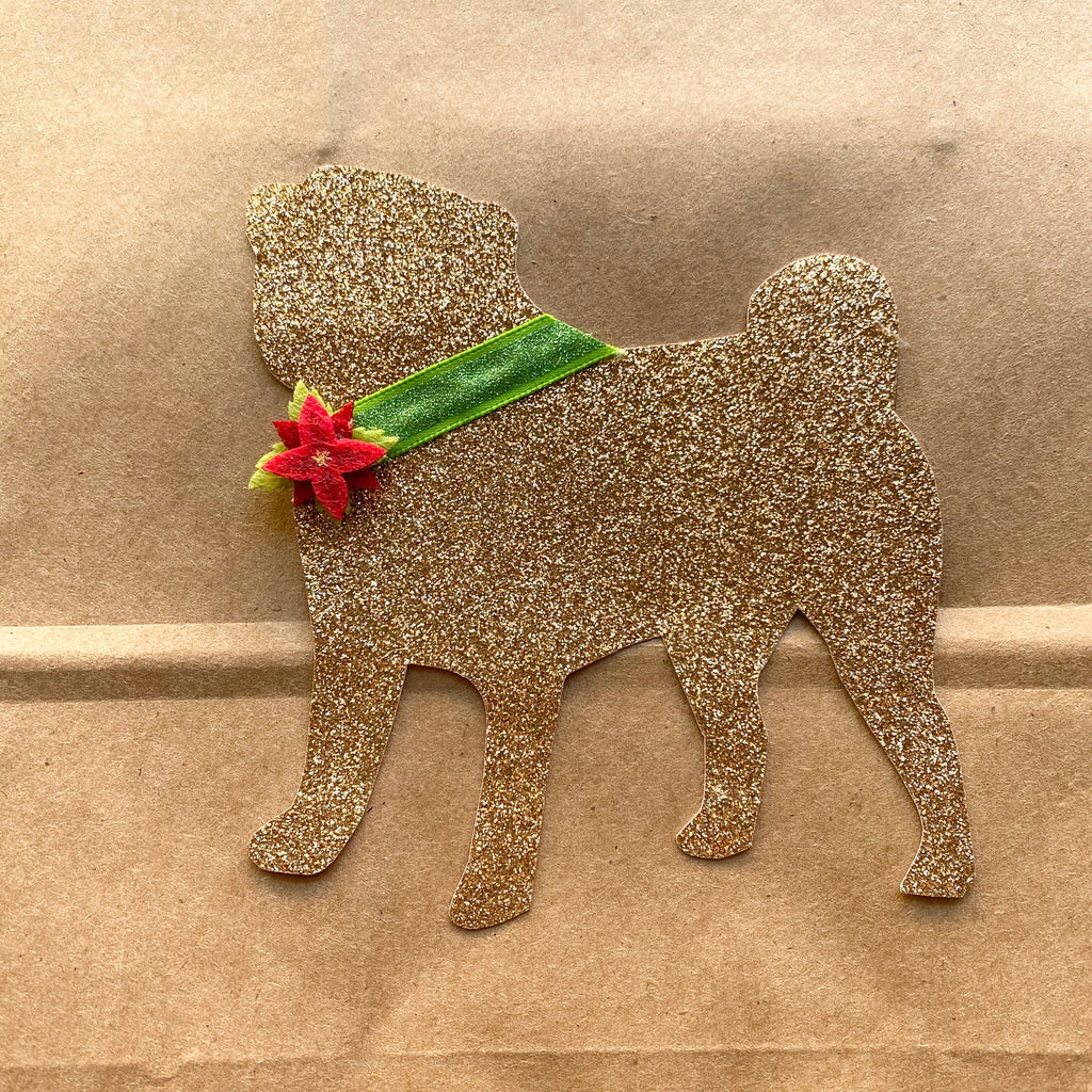Wrap your holiday gifts in style with these pug gift bags! The set includes: (2) unique pug silhouette kraft gift bags with poinsettia flower collar. Each bag comes with white tissue paper.
