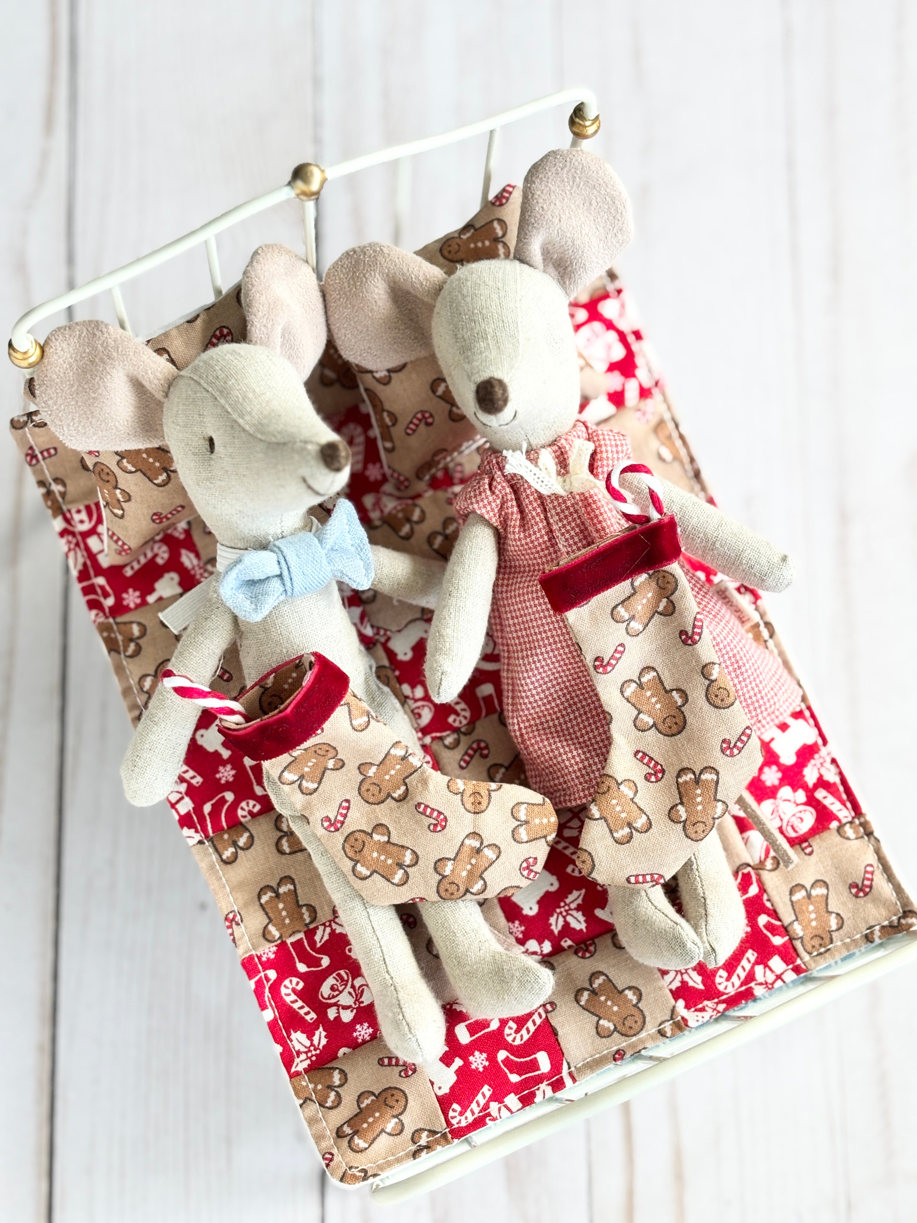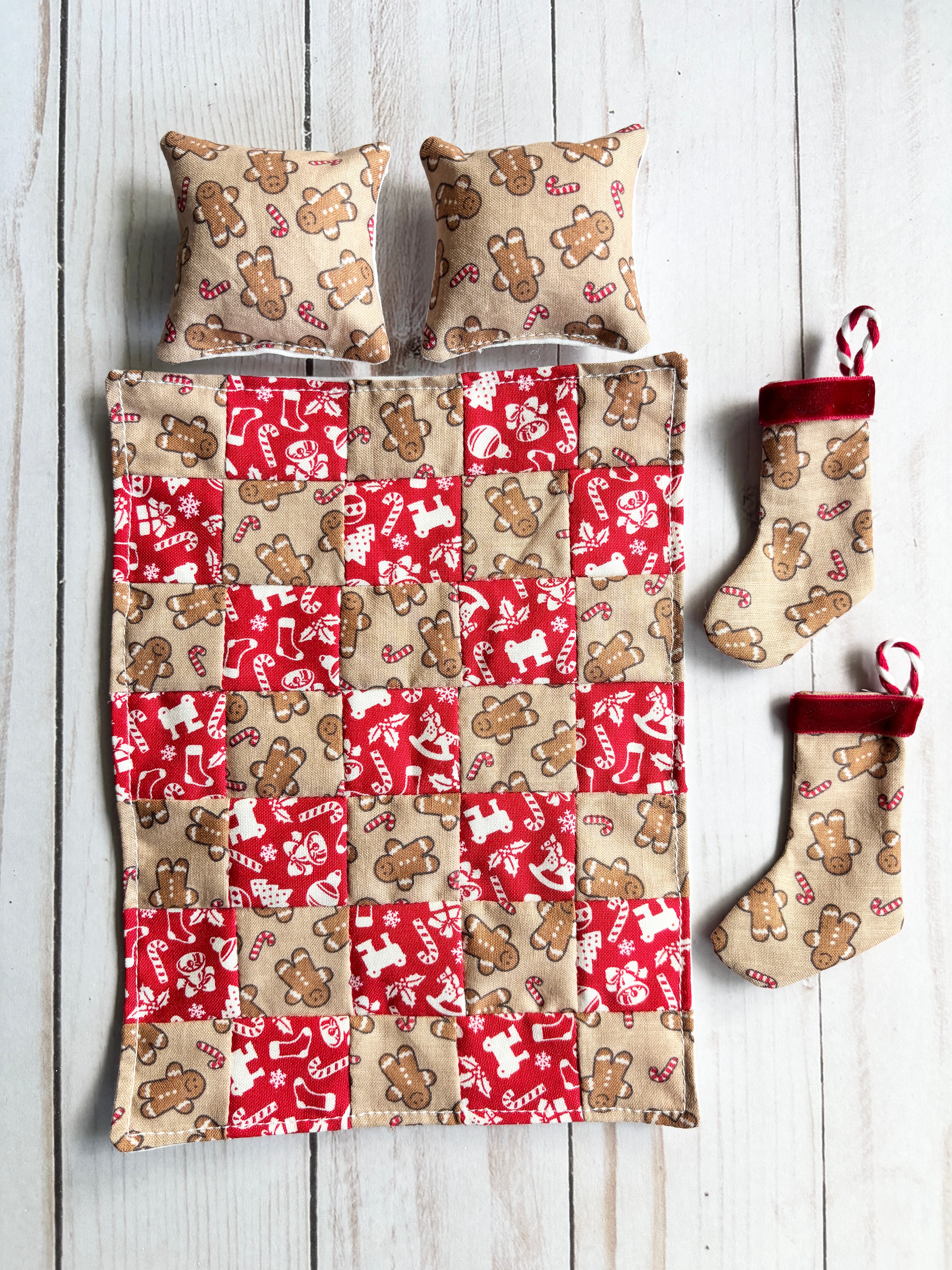 Medium Dollhouse Christmas Gingerbread Quilt, pillow, stocking - Miniature Bedding Set - Maileg Mouse