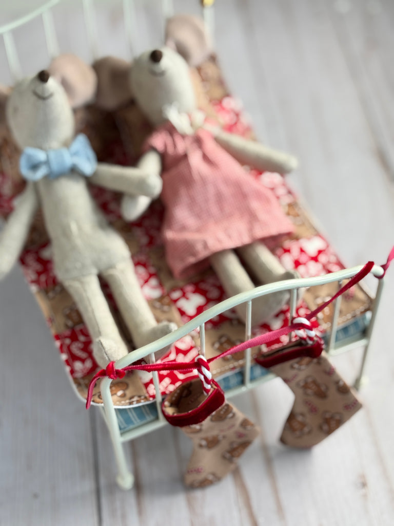 Perfect set for your Christmas Gingerbread house! This listing for this medium quilt and matching pillow and stocking specially made for 1:12 scale, made to fit a Maileg double bed. Comes with 2 matching Gingerbread pillows and 2 Christmas stockings with red velvet top with red/white hanging twine.