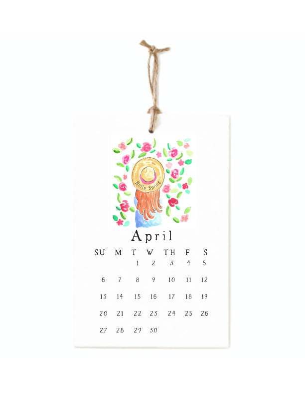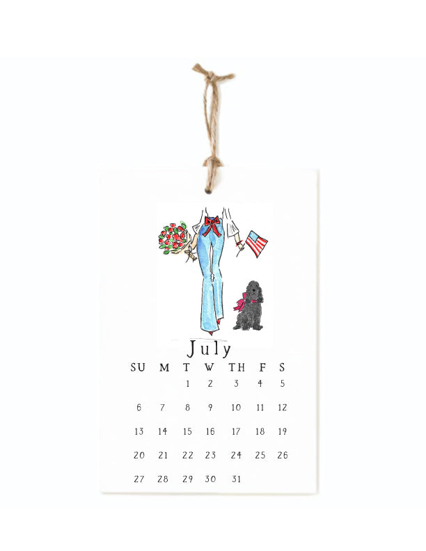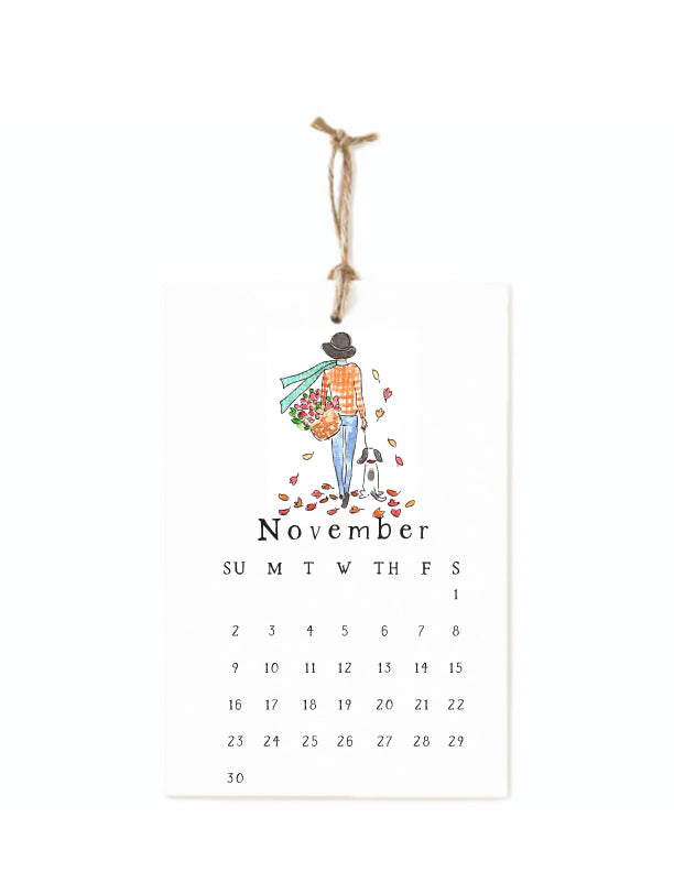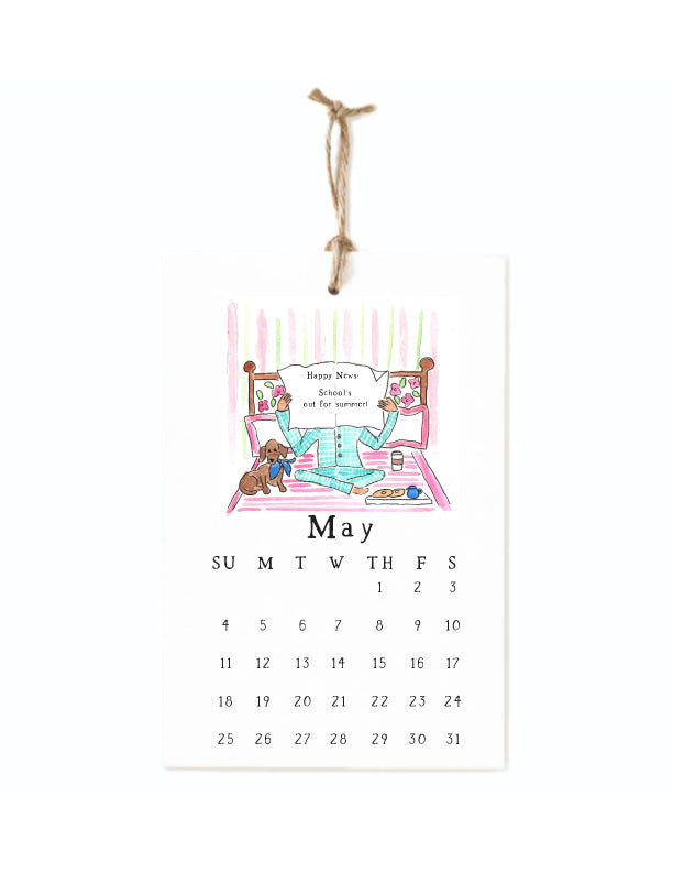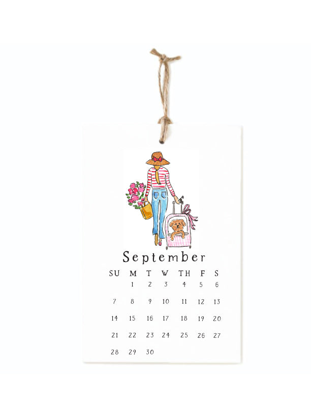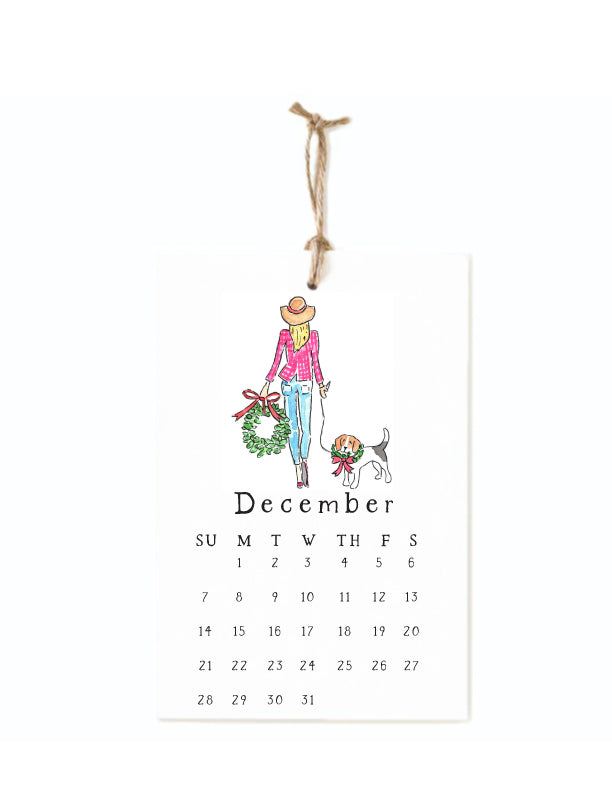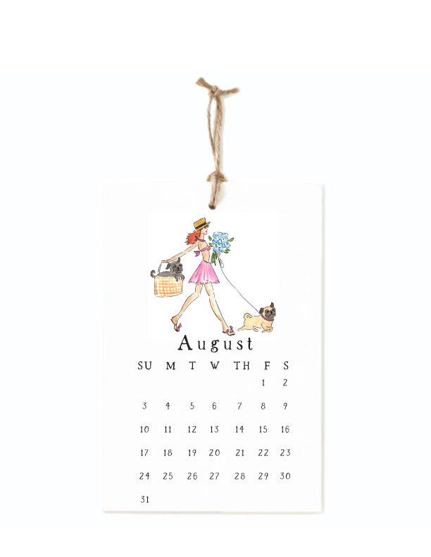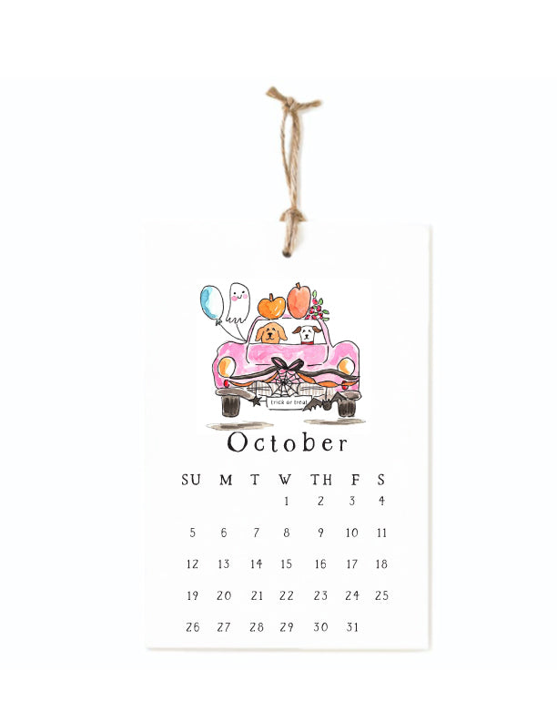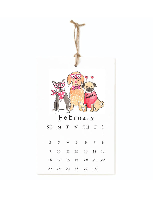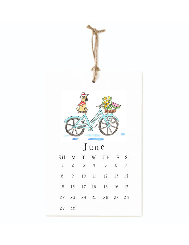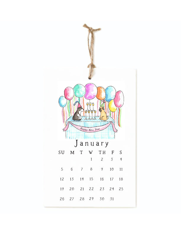 2025 Dogs Calendar features 12 unique watercolor painted dog illustrations. It fits excellently above a desk or kitchen wall. Each month contains varying dog breeds dressed seasonly and having fun in a whimsical way. Calendar is tied with twine for hanging.