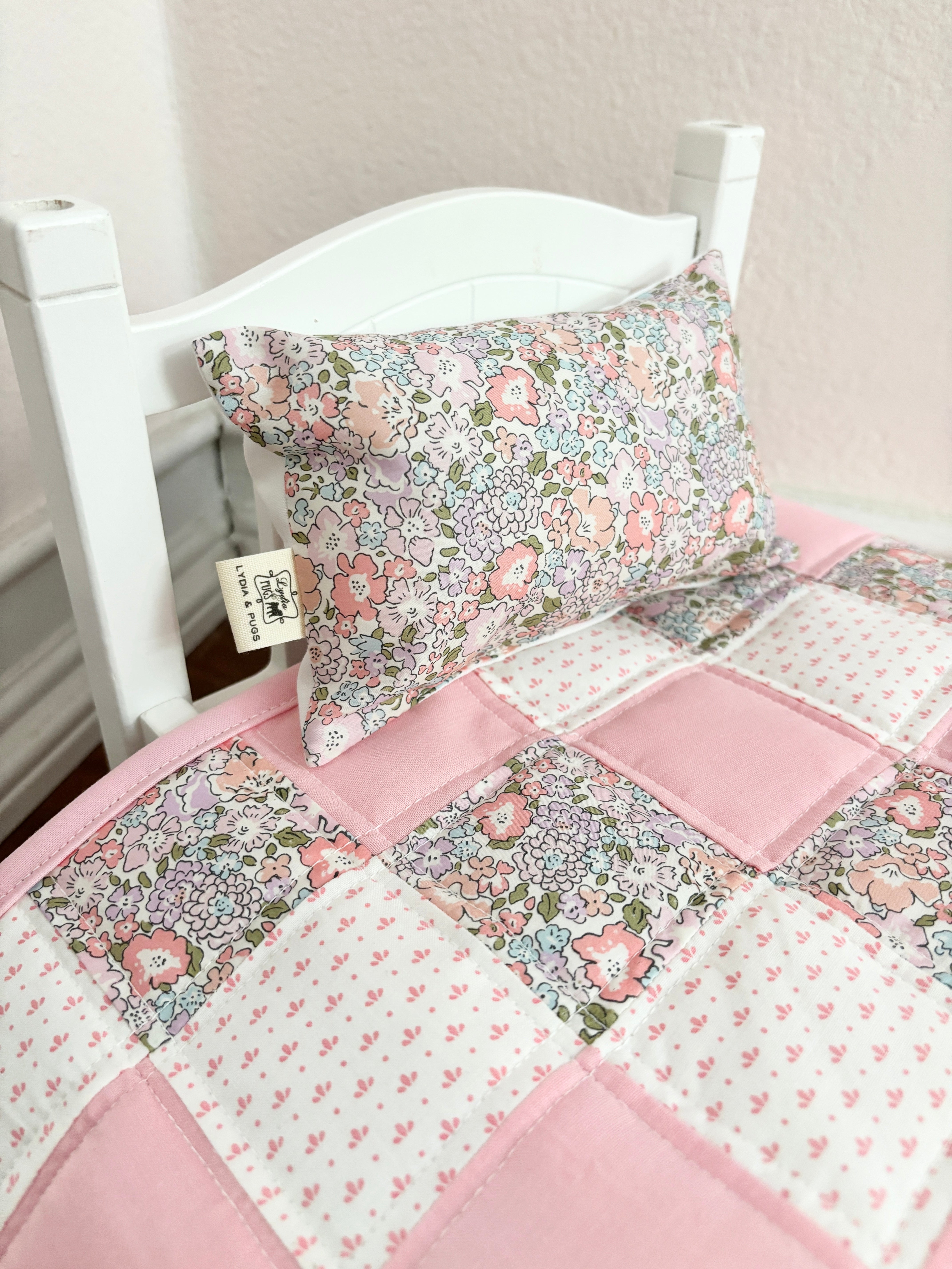 This sweet little quilt is lovingly handmade featuring Michelle E Liberty light pink Liberty of London fabric. Perfectly sized for 18” American Girl dolls, stuffed animals, or as a charming accent piece, it brings a touch of vintage charm and timeless beauty to playtime or display. Each square is individually hand cut and carefully pieced together, making every quilt one-of-a-kind. The pillow matches the quilt for a coordinated set.